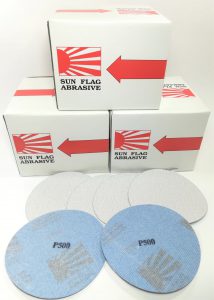 กระดาษทรายกลม SUNFLAG(AO) หลังสักหลาด/หลังกาว 4นิ้ว, 5นิ้ว, 6นิ้ว มีรู/ไม่มีรู